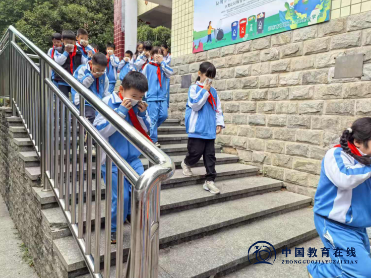 当广播相继发出地震避险及火灾疏散指令后,班主任迅速组织学生成两列纵队,指导大家用衣角、湿毛巾捂住口鼻,保持弯腰低姿姿势快速列队。走廊及楼梯口的值守教师全程坚守岗位,及时提醒学生“靠右走,别推挤”,数学教师在队尾细心清点人数,严防学生遗漏,全力保障疏散秩序。